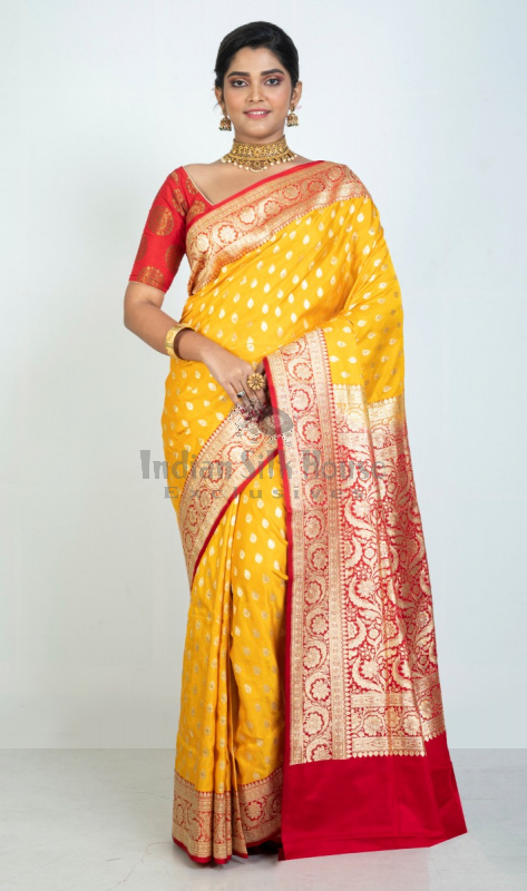 sarees are the finest and the most loved traditional creations of india .This yellow red color handloom Benarasi saree is made with finest premium silk featuring golden zari small butta all over and intricate border-pallu meticulously crafted by the finest artisans of Benaras.