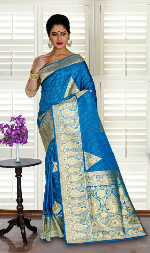 Look beautiful on your wedding reception in this peacock blue pure silk Benarasi saree.