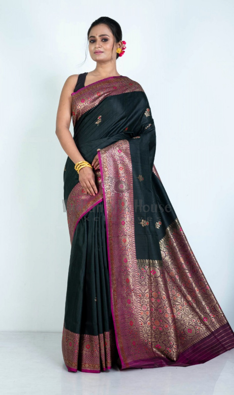It's a handpicked Dupion Silk saree with self stripes in the body and antique zari floral buta highlighted with pink mina.