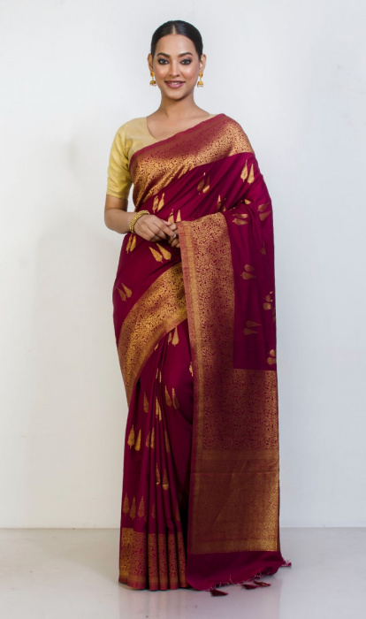 Be the ultimate diva on this Pujo with this wine saree from Indian Silk House Exclusives. Crafted from blended silk fabric with all over resham and zari woven unusual patterns, this gorgeous saree is accompanied by an unstitched blouse to compliment the attire. Finish off the look with a pair of heels and statement jewellery.