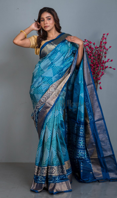 This uniquely designed blue Ikkat silk saree features a stunning geometrical pattern in the body making it an alluring ensemble for parties.The gold zari border with tie and dye pallu adds a contemporary touch to the classy look.