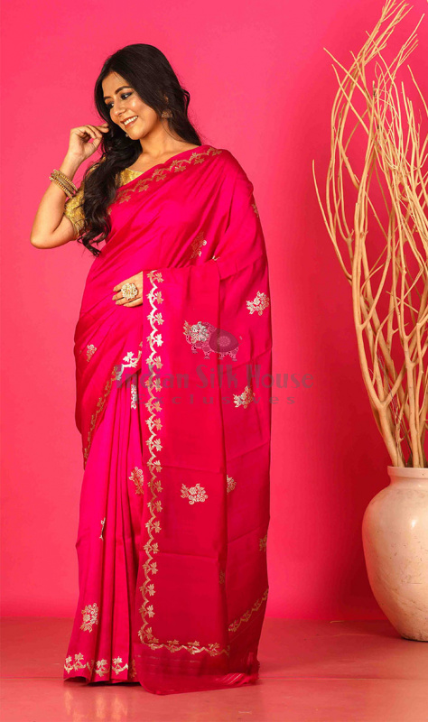 This is a fuchsia pink Katan silk saree with beautiful gold zari buta in the body and scallop border.This type of saree is often loved for weddings and festivals due to its vibrant color and rich zari detailing done in Varanasi handlooms.